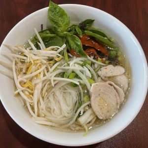 A noodle soup with a rich beef broth made from a long boiling beef and spices. Rice noodle served with brisket, and beef ball. Topping with chopped cilantro, diced green onion, raw sliced onion. A side of lime wedges, jalapenos, mung bean sprouts, basil.