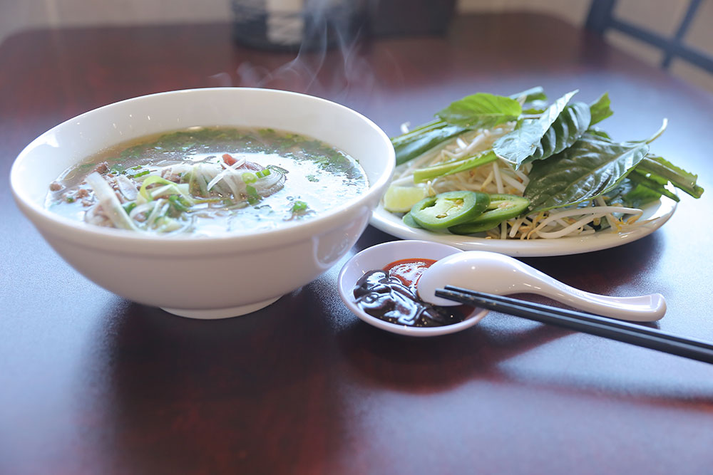 A noodle soup with a rich beef broth made from a long boiling beef and spices. Rice noodle served with thinly sliced sirloin ” cook by the hot broth itseft”, brisket, and beef ball. Topping with chopped cilantro, diced green onion, raw sliced onion. A side of lime wedges, jalapenos, mung bean sprouts, basil.