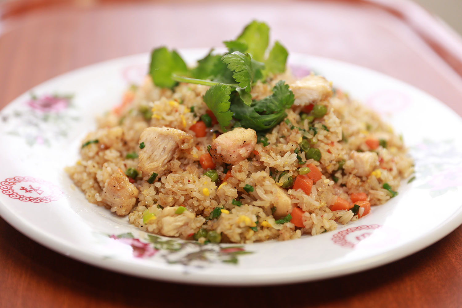 Veggie Ham fried rice is mixed in stir-fried carrot, green peas, egg. Top with chopped green onion