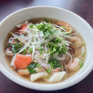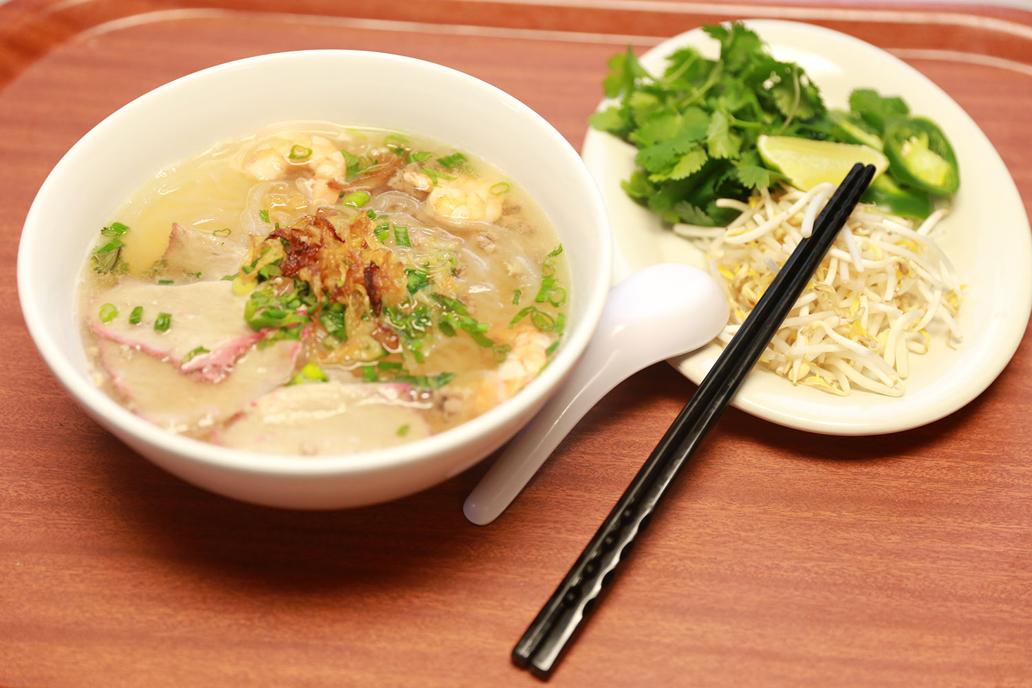 Clear rice noodle, BBQ Pork, Shrimp are served in the pork base soup with side of mung bean sprouts.